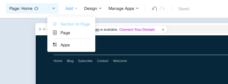 Log in to your Wix account. In the top menu, select Add → Section to Page.